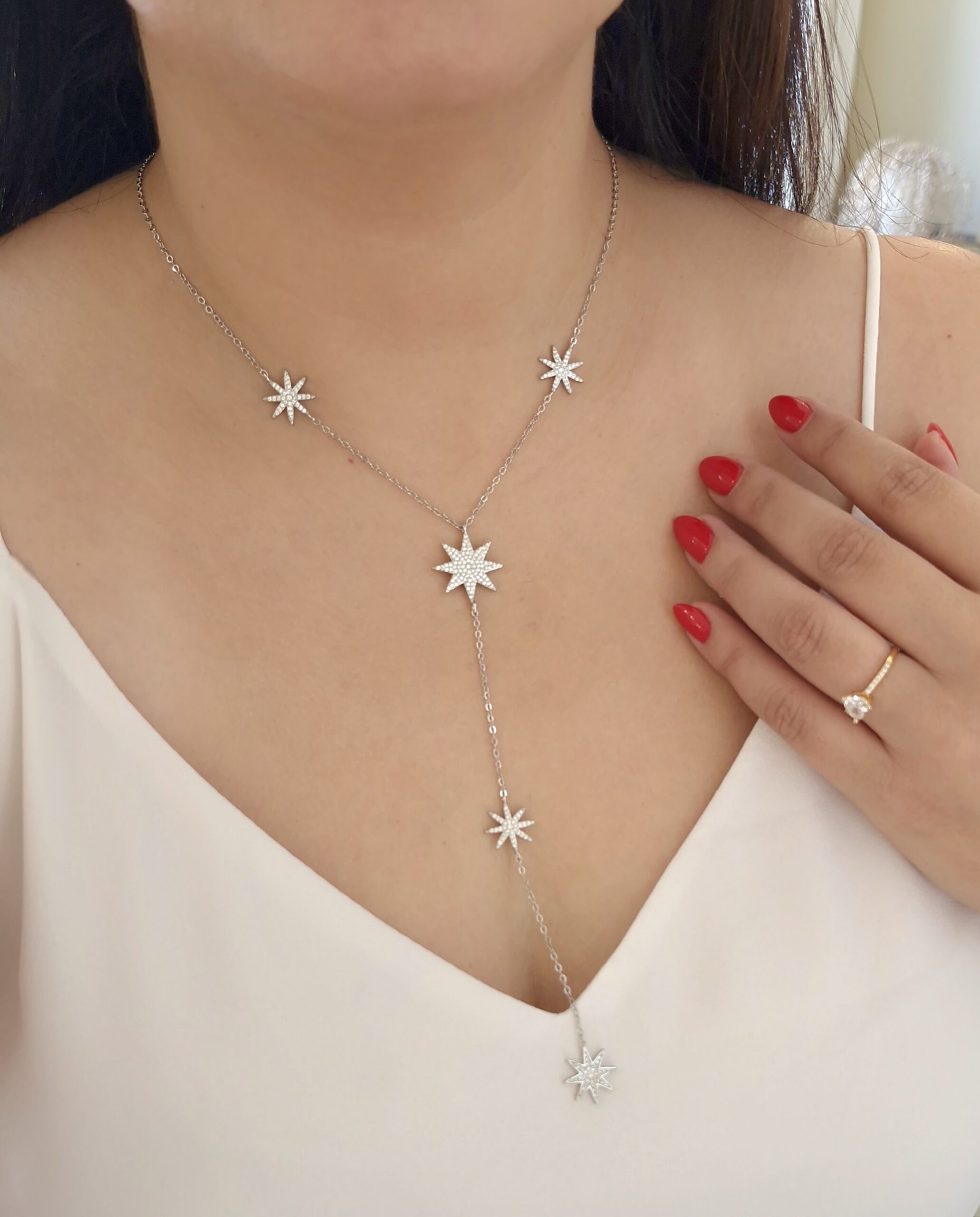 All the stars necklace/Material: Stainless steel/ Non tarnish/ Color: Silver/Stone: Cubic zirconia.