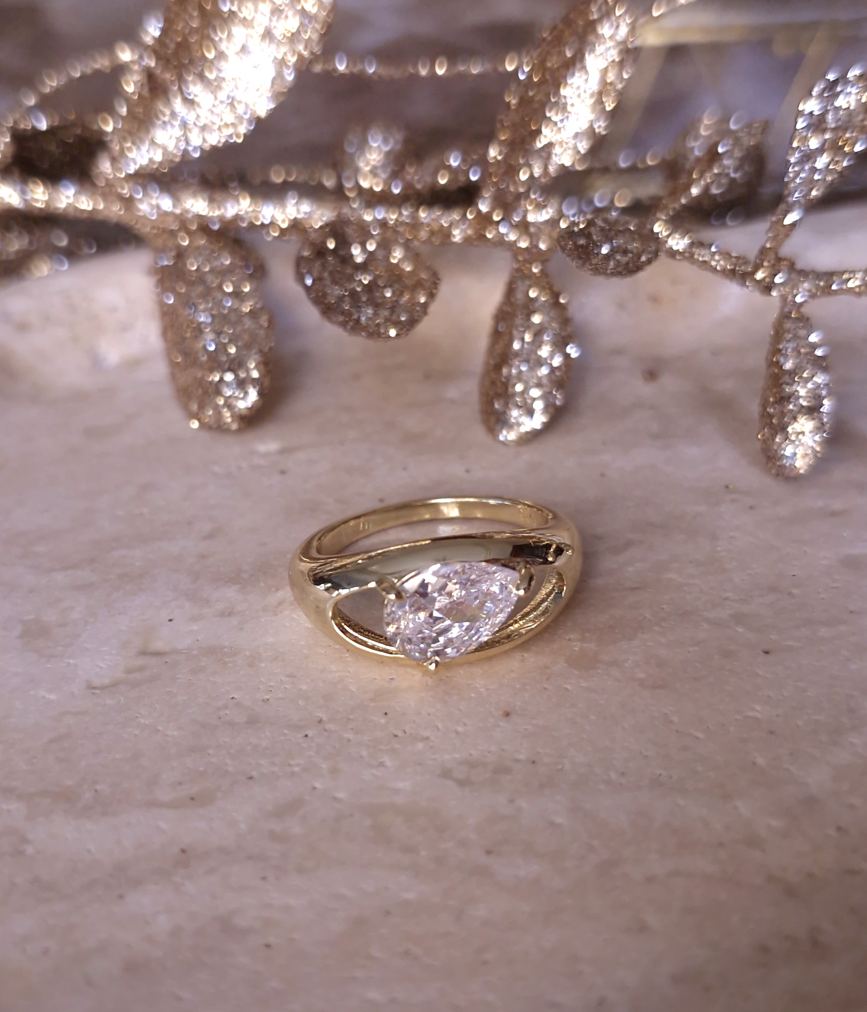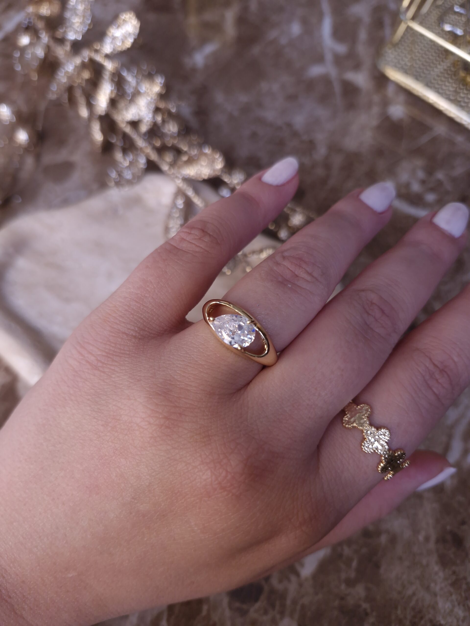 Pear stone ring/ Sterling silver 925/ 18K gold plated/ Size: 7US.